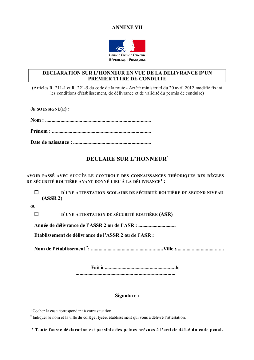 - Copie de l'ASSR 2, ou de l'ASR, signé par le candidat. Si perdu, remplir la déclaration sur l'honneur *télécharger declaration_sur_lhonneur_assr2.jpg
